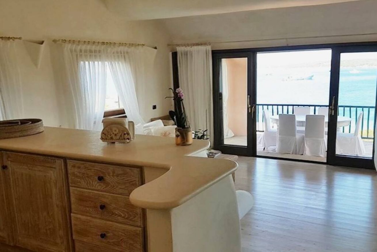 L'arioso soggiorno open space vi accoglie con morbide tonalità di bianco e invitanti trame naturali e si apre su due terrazze, per godere della vista del mare anche durante momenti di relax sul divano. La zona pranzo si trova sulla terrazza, per pranzare o cenare guardando il mare color smeraldo. La cucina è compatta, ma completamente attrezzata.