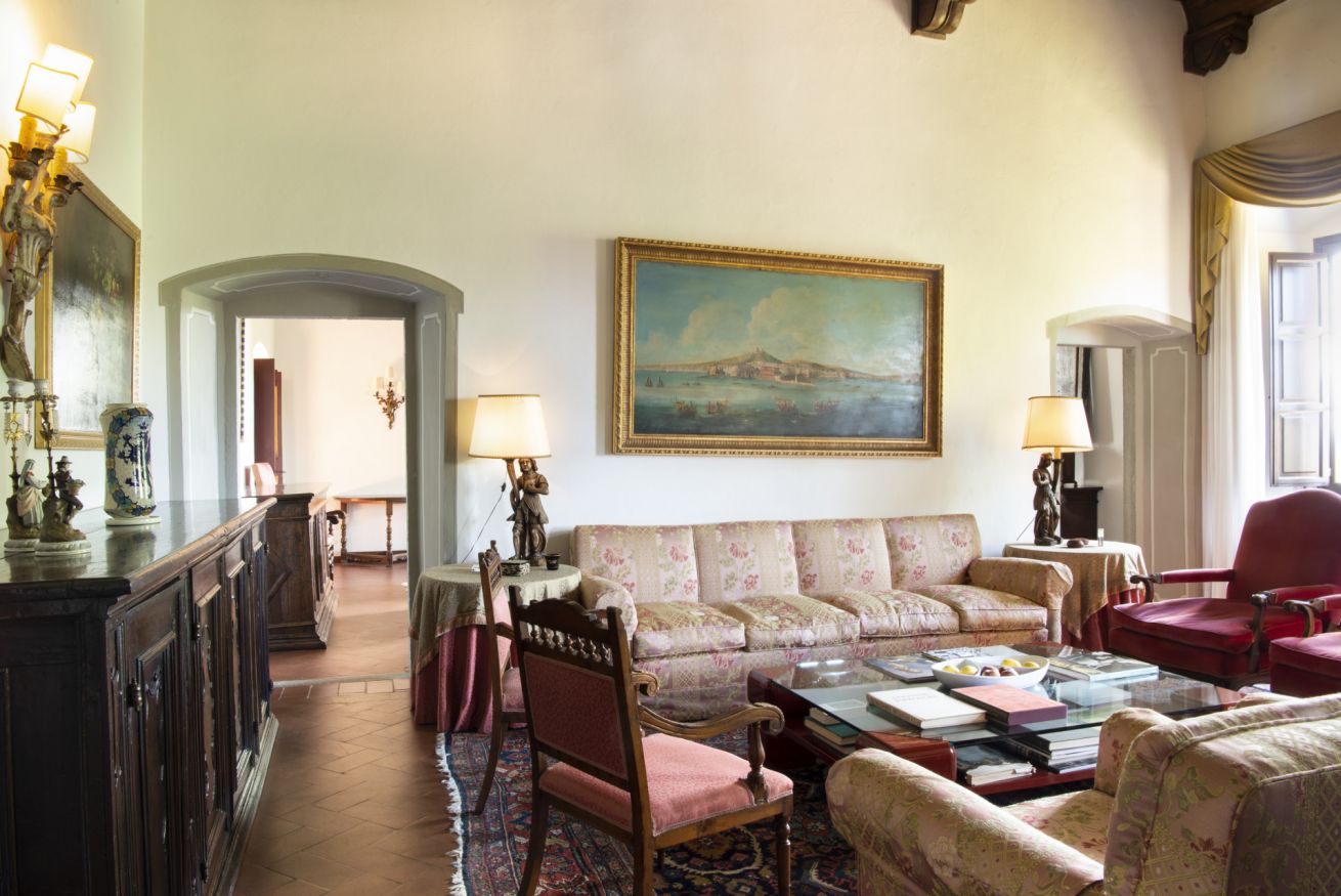 Al primo piano troviamo un magnifico salone con enorme camino, 2 eleganti soggiorni (di cui uno dotato di zona ufficio con fax e connessione internet Adsl), sala da pranzo con un grande tavolo adatto per 14 persone, cucina con forno a microonde, forno tradizionale, congelatore e due frigoriferi, bagno di servizio e 2 camere matrimoniali con bagno en-suite.